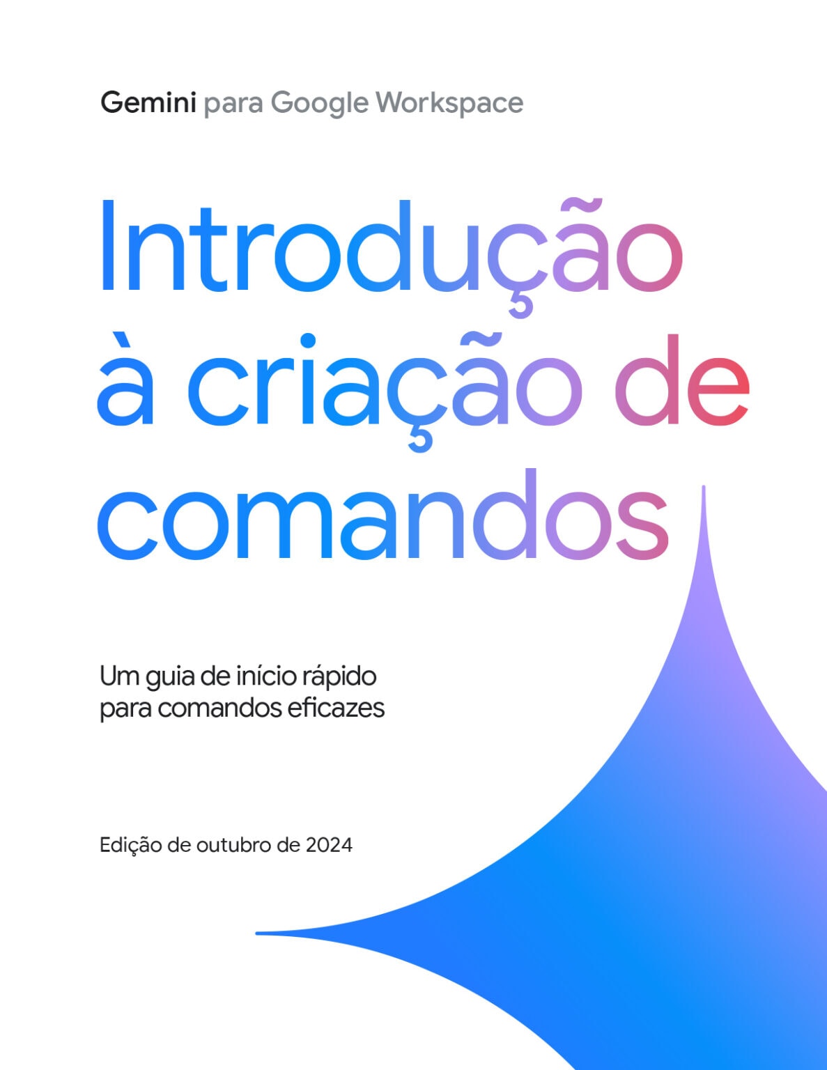 Com o Gemini para Google Workspace, você trabalha com mais eficiência e menos esforço, aumentando sua produtividade e liberando mais tempo para as atividades de maior impacto. Este manual aborda formas diferentes de dominar com rapidez os fundamentos da ferramenta para facilitar seu dia a dia. Conheça as habilidades básicas para escrever Prompts eficientes organizados por função e casos de uso. Ainda que as possibilidades sejam quase infinitas, há certas práticas recomendadas que você pode começar a seguir hoje mesmo. Aproveite!